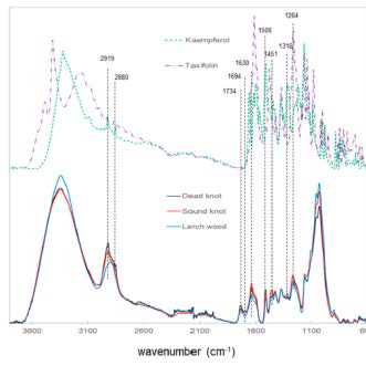 FT-IR spectra of different larch knotwood samples and references